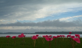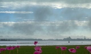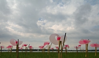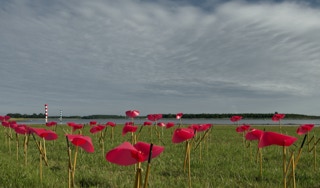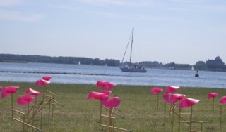 A field full of small kinetic wind sculptures for Dynamic Art Delta, Kamperland. All small windsculptures work together.