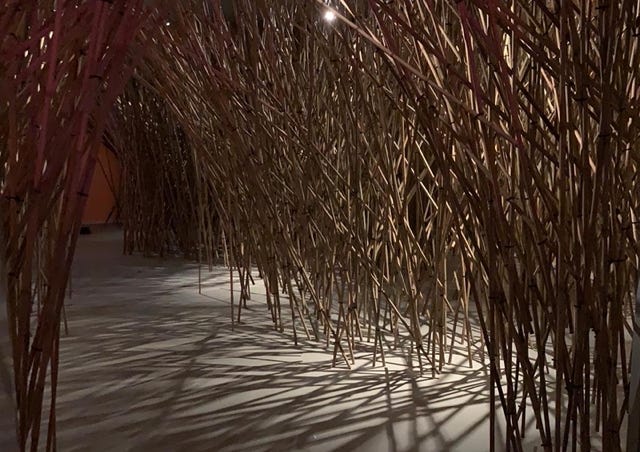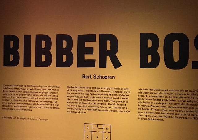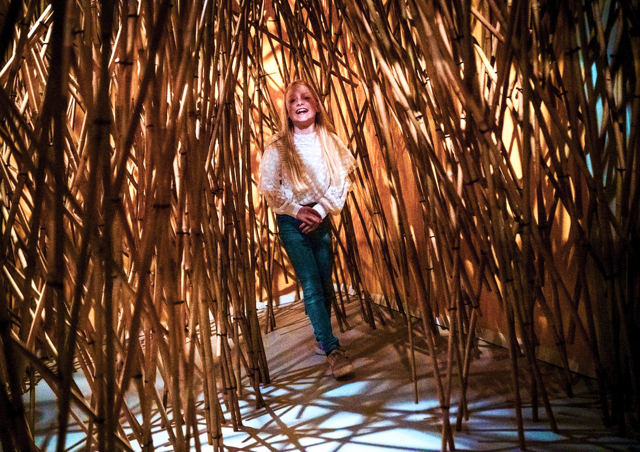 The Bamboo Shiver Forest. A room in the museum is filled with a few thousand bamboo sticks, criss-crossed together. There is a labyrinth through this stick forest that you can wander through. There are vibrating sticks in the forest. These will vibrate as soon as you touch them. Light and shadow, vibrating sound and silence alternate and visitors can experience the beauty of chaos. If you come into a strange, unusual environment you can be surprised. Your senses are stimulated and you are challenged to interact, to participate. You have to discover and explore by going deeper into the forest. With the shivering forest, visitors can decide for themselves, while playing, how far they let the chaos go.