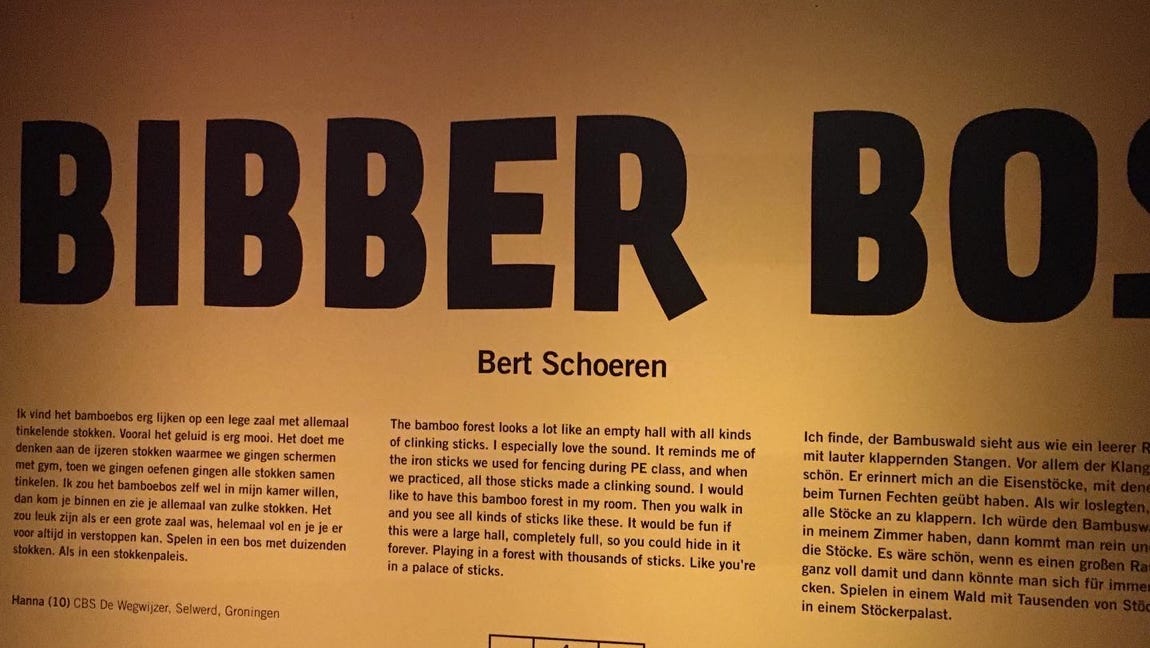 Bert Schoeren maakt kinetische sculpturen die bewegen op wind-, water- of zonne-energie of door toedoen van de mens. Voor de Kinderbiënnale heeft Bert het Bamboe Bibber Bos ontworpen. Een zaal in het museum is gevuld met een paar duizend bamboestokken, kris kras door elkaar. Er is een labyrint door dit stokkenbos waar je doorheen kunt dwalen. In het bos hangen trilstokken.